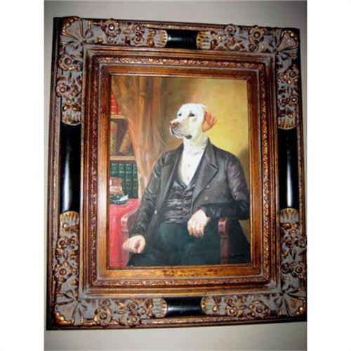 Portrait of a fancy dressed man with the head of a labrador dog. Great decorator item for that dog lover.