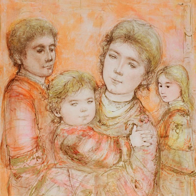 "Portrait of a Family" is a limited edition lithograph on paper, numbered and hand signed by Edna Hibel (1917-2014). Includes Certificate of Authenticity! Measures approx. 31" x 45" (with border) 28" x 40" (image).
