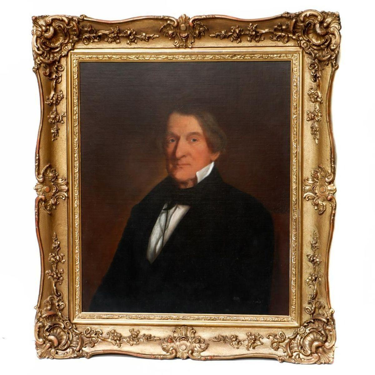 Artist: Unknown. Title/Subject: Portrait of a Gentleman. Size: 26in x 21in; 40in x 35in x 3 1/2in (frame). Year Created: c. late 19th century. Signature: Unsigned. Medium/Ground: Oil on board. Condition: Some surface scuffing. Small losses to frame, possibly repainted. NOTE: LARGE/HEAVY FOR SHIPPING. Condition Report: All lots are sold as is and where is. Turner Auctions + Appraisals, LLC provides condition reports upon request to aid in your bidding decision. No statement regarding age, condition, kind, value, or quality of a lot, whether made orally at the auction or at any other time, or in writing in this catalog or elsewhere, shall be construed to be an express or implied warranty, representation, or assumption of liability. All sales are final, Turner Auctions + Appraisals, LLC does not give refunds based on condition. Turner Auctions + Appraisals, LLC does not perform any shipping or packing services. We do have a list of suggested shippers who gladly provide quotes prior to your bidding. Please visit our webpage for a list of recommended shippers.