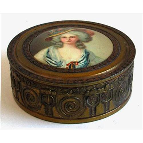 This lovely brass powder dish features a portrait of an elegant Victorian lady with a flowered hat and, it appears, powdered wig. There is a mirror inside the lid with a label giving cleaning instructions to maintain the brass luster and a glass insert bowl in the base of the brass jar. Both the jar and lid are embossed with several intricate surrounds of braid, florals and scrollwork. The bottom is marked P.N.C.W Made in the U.S.A. It measures about 4 1/2 inches across the base x 2 1/2 inches tall and with the exception of moderate tarnishing and a few scratches on bottom, due to age, the brass jar, its brass lid, the glass insert, and most importantly the celluloid protected portrait are all in excellent condition