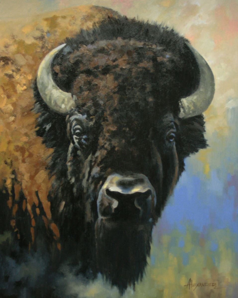 Artist: Colin Alexander. Title: Portrait of a Shaggy Beast. Medium: Oil on gesso panel. Size: 20" x 16". Framed size (if applicable): 26" x 22" Artist's description: I encountered this older bull bison while observing a small herd of about 15 or 20, he seemed fascinated by my presence and remained focused on me for sometime. Shipping from ZIP CODE 49055.