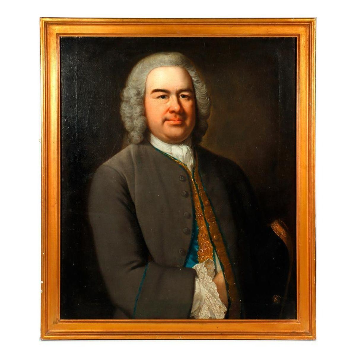 Artist: Unknown. Title/Subject: An 18th century gentleman with lace cuffs and captain's hat under his arm. Size: 29 1/4in x 24 1/2in; 28 1/4in (frame). Year Created: c. 18th/19th century. Signature: Unsigned. Medium/Ground: Oil on canvas, appears to be laid on/backed by board. Condition: Craquelure; raised outline from former stretcher; spots of paint dribble and possible small spots of in-painting. Condition Report: All lots are sold as is and where is. Turner Auctions + Appraisals, LLC provides condition reports upon request to aid in your bidding decision. No statement regarding age, condition, kind, value, or quality of a lot, whether made orally at the auction or at any other time, or in writing in this catalog or elsewhere, shall be construed to be an express or implied warranty, representation, or assumption of liability. All sales are final, Turner Auctions + Appraisals, LLC does not give refunds based on condition. Turner Auctions + Appraisals, LLC does not perform any shipping or packing services. We do have a list of suggested shippers who gladly provide quotes prior to your bidding. Please visit our webpage for a list of recommended shippers.