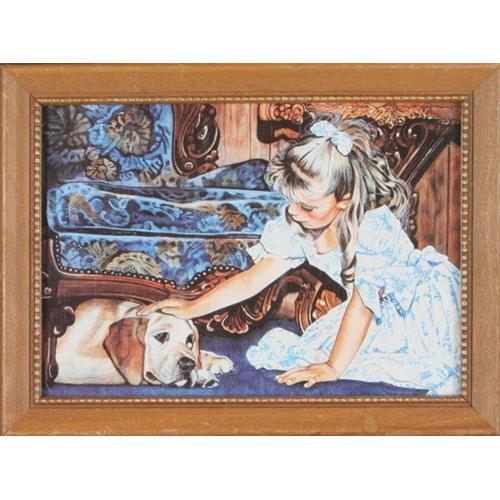 This is a lovely print of a girl beside her best friend who seems to be relaxing with her stroking. The print is in very good condition and shows in crisp clarity the many details that the original artist so meticulously rendered. This print is perfectly framed in a gold and brown wood frame that compliments the picture perfectly. This print measures a total of 6? x 8? framed.