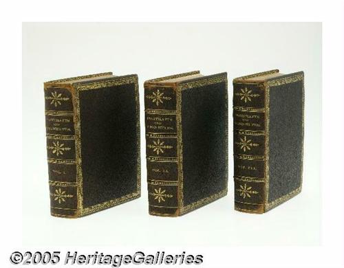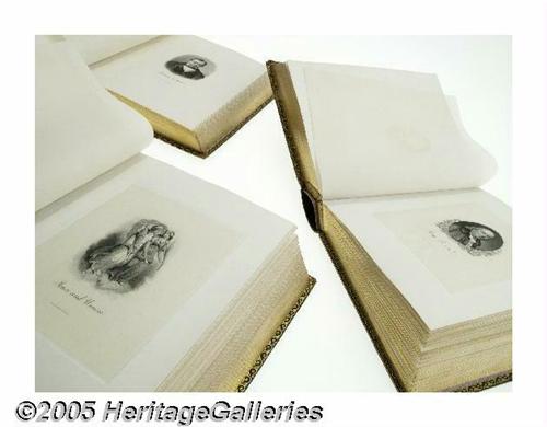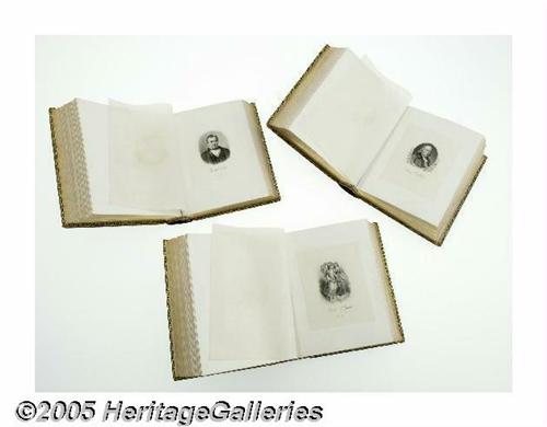 <B>Portraits and Vignettes Engraved by the Bureau of Engraving and Printing Treasury Department</B></I> Three Volumes Unpaginated circa 1893-97<BR>Presented here are three large illustrious volumes at the pinacle of the BEP's art. Presidents, politicians, government officials, soldiers, allegorical figures, government buildings, eagles, vignettes, etc. are all within the covers of these exquisite three volumes. The leather bound books were crafted from the finest materials and consist of ribbed spines, decorative end boards, interleaved pages, gold leaf on the covers, and gilt edges. The top and bottom of the spines show some wear and flaking, but these books are unique in the 12mo size and as a three volume set. These tomes are destined to become a capstone for a glorious numismatic library.<BR>