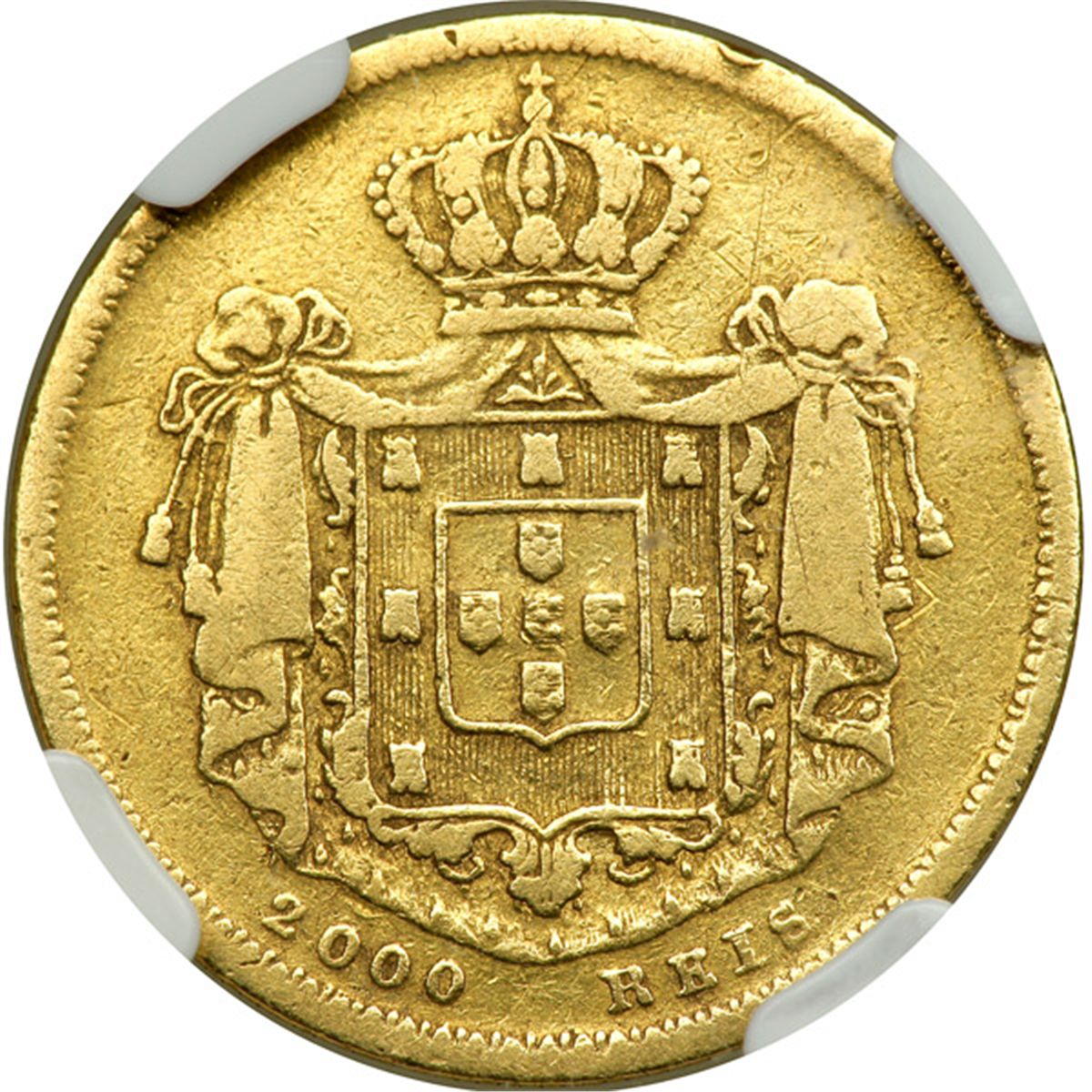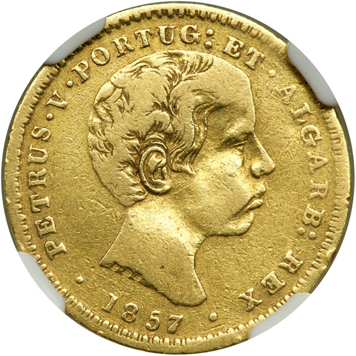 Portugal. 2000 Reis, 1857. Fr-148; KM-496. Weight 0.1046 ounce. Pedro V, 1853-1861. Child right right. Reverse: Crowned arms. NGC graded Fine, Details (Surface Hairlines).