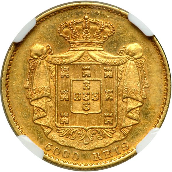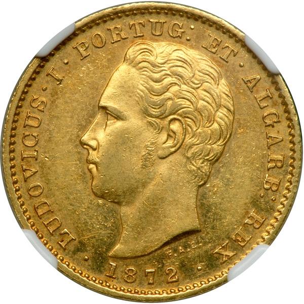 Portugal. 5000 Reis, 1872. Fr-153; KM-516. Weight 0.2614. Luis I. Older bust left. Reverse: Crowned arms. NGC graded AU-58.