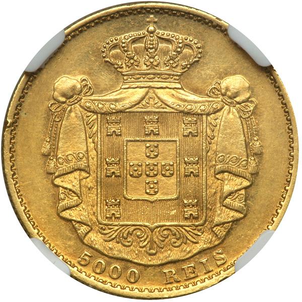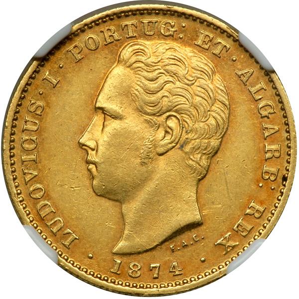 Portugal. 5000 Reis, 1874. Fr-153; KM-516. Weight 0.2614. Luis I. Older bust left. Reverse: Crowned arms. Scarcer date only 6800 struck. NGC graded AU-55.