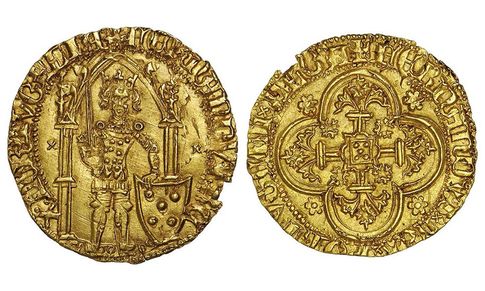 D. Fernando I, meia dobra pe terra (540 dinheiros), Lisbon, the king standing facing, crowned and in full armour, holding sword and leaning on shield bearing five besants, within Gothic portico, small crosses in fields to left and right, rev., floriate cross within quadrilobe, small arms on hexalobe in centre, rosettes in spandrels, some double-striking, particularly in the legend, almost as struck, exceedingly rare.
