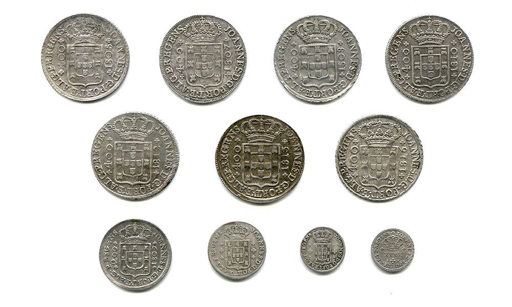 Cruzado novo 1805 4p, 1807 1p EV, 1808 2p EV, 1810 2p, 1812 2p, 1813 4p,1816 4p (24.02, 25.05, 26.04, 26.07, 26.09, 24.05, 24.08); Doze Vinténs 1809 (21.03); Seis Vinténs (19.01); Três Vinténs (15.01); Meio Tostão (13.02)