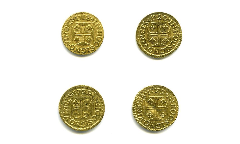 Ouro Cruzado novo (Pinto) 1718 (4 arcos) (G.83.01; JS J5.406)BC; Cruzado novo (Pinto) 1720 (4 arcos) (G.83.03; JS J5.408) MBC; Cruzado novo (Pinto) 1721 (4 arcos)(G.83.04; JS J5.409) BC+; Cruzado novo (Pinto) 1722 (4 arcos)(G.83.05; JS J5.410)MBC