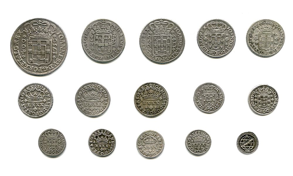 Cruzado novo 1750 d.l.s.1p. (78.01) MBC; Doze Vinténs 1747 arcos duplos (74.01) BC+; Doze Vinténs 1749 arcos simples (75.03) BC+; Seis Vinténs escudo largo (67.01) BC+; Seis Vinténs coroa de 5 arcos (71.01) BC+; Tostão (59.01) MBC; Tostão (62.01) MBC+; Tostão (64.01) MBC; Três Vinténs (50.02) MBC; Três Vinténs, P (54.01) MBC; Três Vinténs, legenda sem pontos (57.02) MBC; Meio Tostão (45.01) MBC+; Meio Tostão (45.02) MBC; Meio Tostão, coroa de 5 arcos (48.01) MBC; Vintém (37.01)
