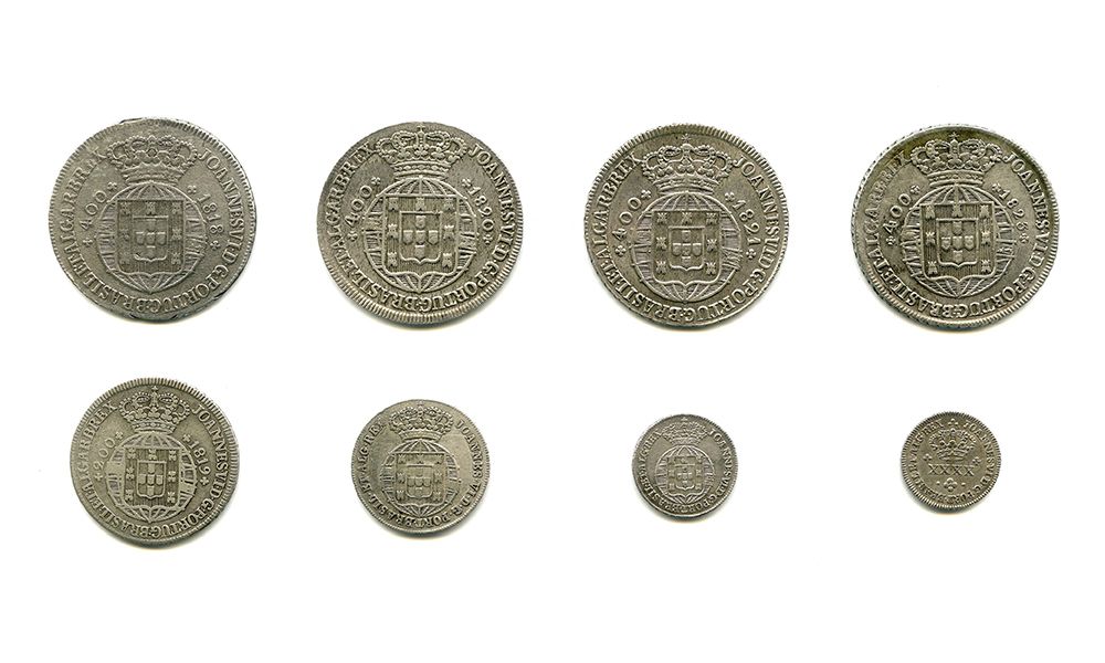 Cruzado novo 1818 alg.grandes (12.09) BC+, 1820 alg. pequenos (12.03) BC+, 1821 alg.grandes (12.13) MBC, 1823 alg. pequenos (12.06) BC+; Doze Vinténs 1819 alg.grandes, c.i. (11.04) BC; Seis Vinténs c.i., d.l.s.1p. (10.04) BC; Três Vinténs