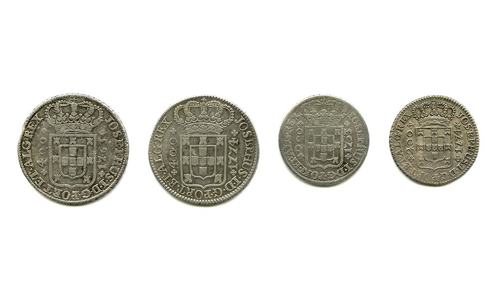 Cruzado novo 1763 J, coroa com pedunculos (34.03) BC+, 1774 J, coroa sem pedunculos (35.05) BC; Doze Vinténs 1774 cruz potentada (30.09) BC+, 1753 I, 4 arcos (26.01) BC