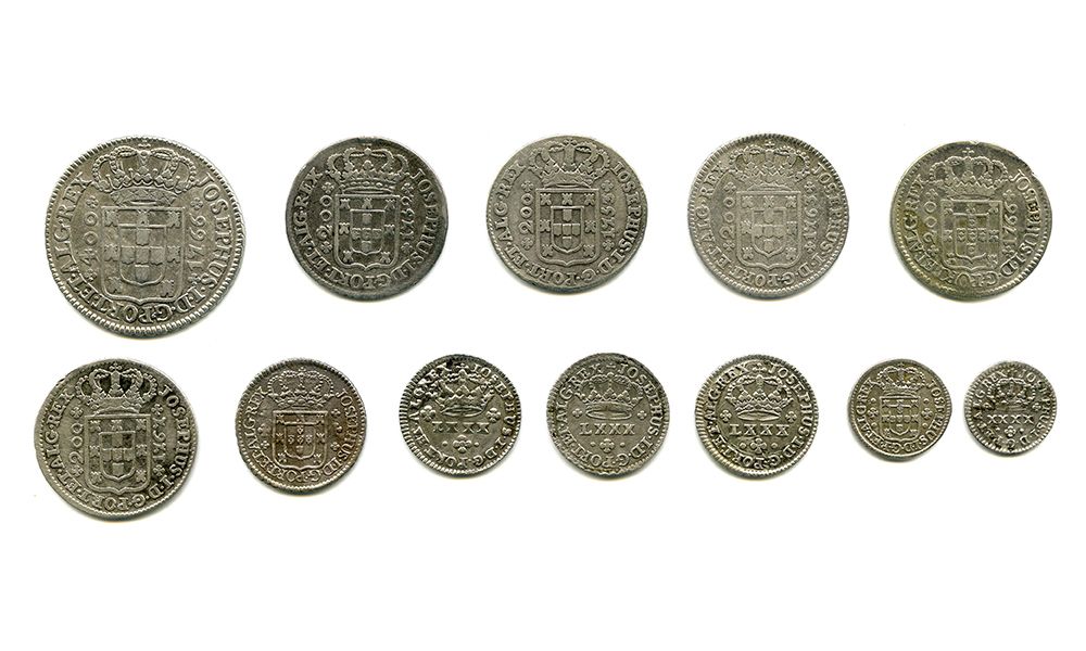 Cruzado novo 1766 - J, coroa com pedúnculos (34.05) BC+; Doze Vinténs 1752 I, 4 arcos (26.01), 1753 I, 5 arcos (27.02), 1763 J (30.02) BC, 1766 J (30.04) BC, 1767 J (30.05) BC; Seis Vinténs J d.l.s.2.p. (22.01) MBC; Tostão J, 5 arcos (16.01) MBC, Tostão J (x2)(19.01 e 19.02); Três Vinténs J, cruz simples (15.01) MBC; Meio Tostão J (12.02) BC+