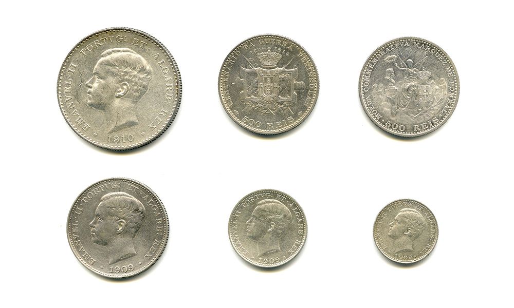 1000 Réis 1910 Guerra Peninsular (07.01); 500 Réis 1910 Guerra Peninsular (05.01), 1910 Marquês Pombal (06.01) (x2), 1908 (04.01), 1909/8 data em 9/8 (04.04); 200 Réis 1909 (03.01)(x2); 100 Réis 1909 (02.01); 5 Réis 1910 (01.01