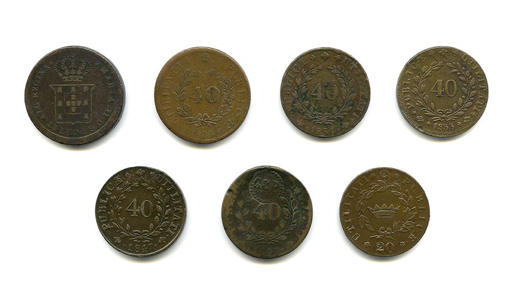Pataco 1833 hastes curvas, com arruelas (07.01) BC, 1833 hastes curvas, sem arruelas (07.01) BC, 1833 EV (14.02) BC+, 1834 EH (14.05) BC, 1847 cruz simples (14.07) MBC+; Carimbo “GCP ponto” sobre Pataco 1847 de Maria II (21.08) BC; Vintém