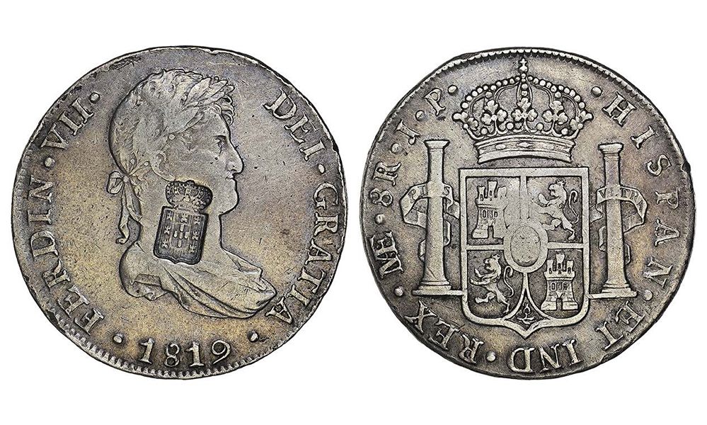 Carimbo Escudo coroado sobre 8 Reales 1819 Lima Perú MBC