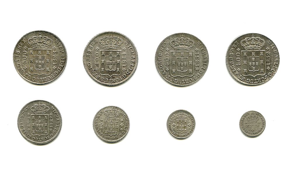 Cruzado novo 1828 coroa estreita (11.01) MBC, 1828 coroa larga (12.01) MBC, 1831 coroa larga (12.04) MBC-, 1832 coroa larga (12.05) MBC; Doze Vinténs 1829 c.i. (10.02) MBC; Seis Vinténs (09.01) lindo MBC; Três Vinténs (06.03) lindo MBC; M