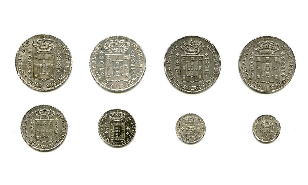 Cruzado novo 1828 coroa estreita (11.01) MBC, 1830 coroa larga (12.03) lindo MBC, 1832 coroa estreita (11.02) MBC+, 1833 coroa larga (12.06) MBC-; Doze Vinténs 1830 c.i. (10.05) MBC; Seis Vinténs (09.01) lindo MBC; Três Vinténs (06.03) MB