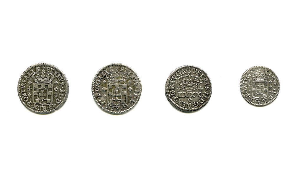 Tostão coroa de príncipe simples, EV (48.01) BC+; Tostão coroa de príncipe simples, eixo às 3 horas (48.01) BC+; Quatro Vinténs PORTVGA coroa de príncipe simples, EV (42.01) MBC+; Meio Tostão PORTVGAL. coroa de príncipe simples, EV (33.02) lindo MBC