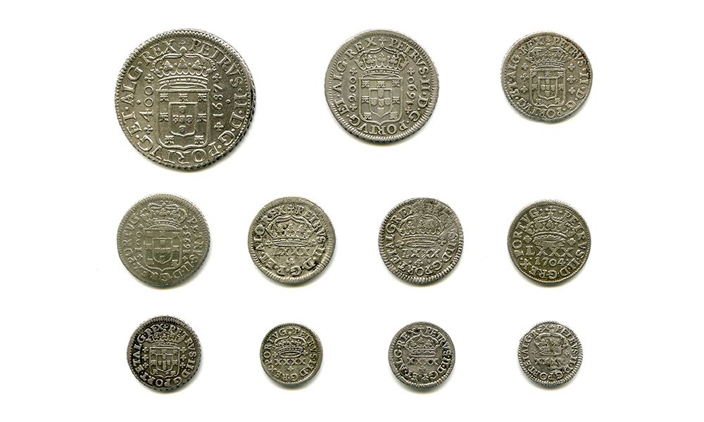 Cruzado 1687 EV (73.02) BELA; Doze Vinténs 1690 EV (62.04) MBC; Seis Vinténs PORTVG EV (49.02) BC+; Seis Vinténs 1693 P (52.09) MBC-; Tostão .D.G.P., EV (43.00) MBC; Tostão .D.G.PORT., EH (44.04) BC; Tostão 1704 P (46.09) MBC; Três Vinténs DG.PORT, EV (34.09) lindo MBC; Meio Tostão D.G.PORT, eixo às 9 horas (25.01) BC+; Meio Tostão .DG.P., EH (31.01) MBC; Dois Vinténs coroa de príncipe, EV (21.01) MBC