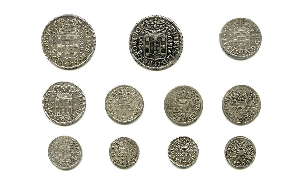 Doze Vinténs 1688 P (68.01) MBC+; Doze Vinténs 1689 P (65.01) MBC; Seis Vinténs PORTVG, EV (49.02/05) BC; Seis Vinténs PORT, EV (50.05) MBC+; Tostão PORT.ET.ALG., EV (43.04) MBC; Tostão 1689 P (45.01) BC+, 1692 P (47.03) MBC; Três Vinténs D.G.PORT, EV (35.05) MBC-; Meio Tostão eixo às 9 horas (25.06) MBC; Meio Tostão P (32.01) MBC; Doze Vinténs coroa de príncipe, EH (24.01) MBC+