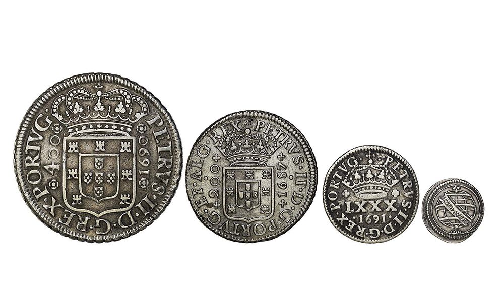 Cruzado novo 1690 P (90.01) MBC+; Meio Cruzado 1687 EH (59.03) MBC+; Doze Vinténs 1689 EV (61.04) MBC; Seis Vinténs 1689 P (52.01) risco BC+; Tostão PORT.ET.ALG, EV, reverso legenda separada por florões (43.07) BC+; Tostão 1691 P (46.03) MBC; Três Vinténs D.G.PORTVG, EH (34.01 var.) lindo MBC; Três Vinténs P PORTVG. (40.01) MBC-; Meio Tostão EH (27.01) MBC; Dois Vinténs coroa de príncipe EH (24.03) MBC; Vintém P (19.01) MBC+