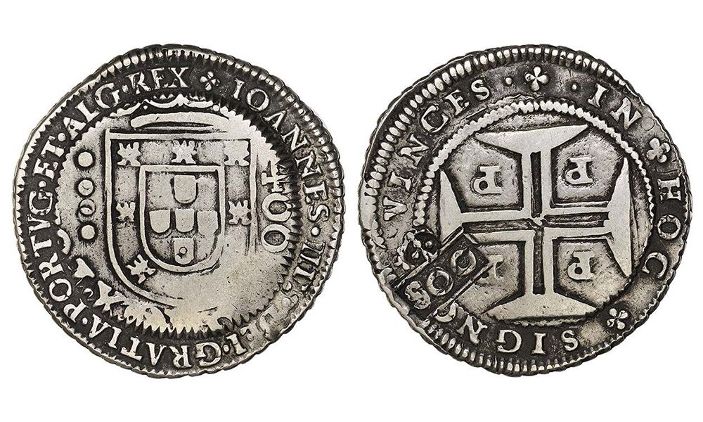 Cordão e cunho de orla nova em Cruzado de D. João IV, Porto com carimbo “S00 coroado” MBC