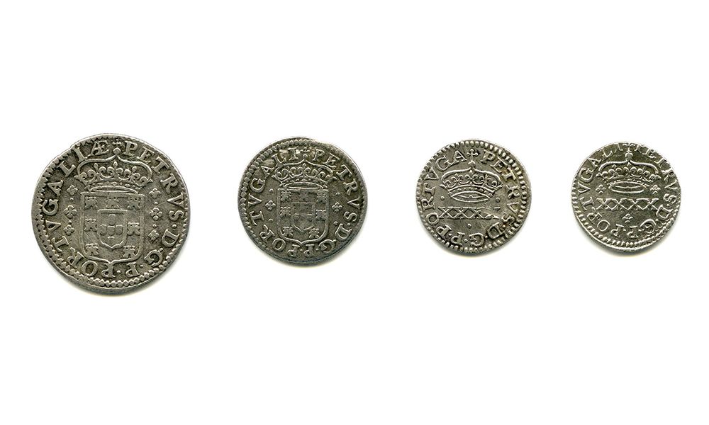 Tostão, pontos entre florões EH (52.01) lindo MBC; Meio Tostão PORTVGALI, eixo às 3 horas (46.02) MBC; Dois Vinténs PORTVGA EV (42.01) MBC+; Dois Vinténs PORTVGALI, eixo às 9 horas (44.03) lig.descentrada MBC+