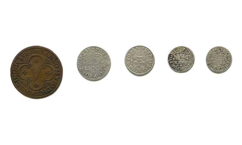 Quatro Vinténs EV (48.01) MBC; Meio Tostão PORTVGALI EV (46.02) MBC+; Dois Vinténs PORTVGAL EV (43.02) MBC; Dois Vinténs PORTVGALI EV (44.03) BC; V Reis 1683 (39.02) BC+