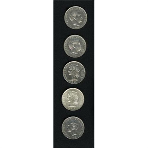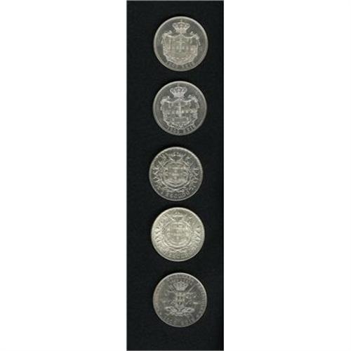 <B>Five nice crowns:</B></I> Carlos I 1000 Reis 1899, KM-540, lustrous AU, another, Unc. with some hairlines, Emanuel II 1000 Reis 1910, KM-558, Choice lustrous AU, (2) 1915 Republic 1 Escudo, KM-564, 2 pieces lustrous AU. <BR><BR><b>Shipping:</b> Coins & Currency (<a target="_blank" href="http://www.heritageauctions.com/common/shipping.php">view shipping information</a>)