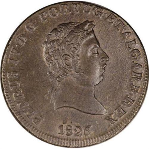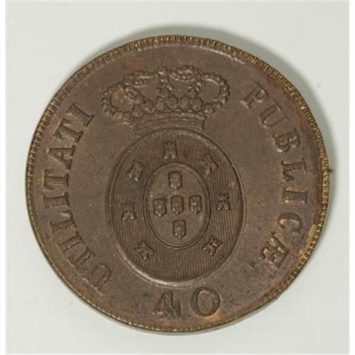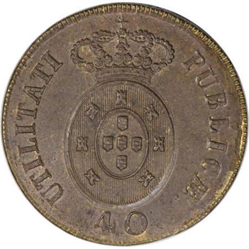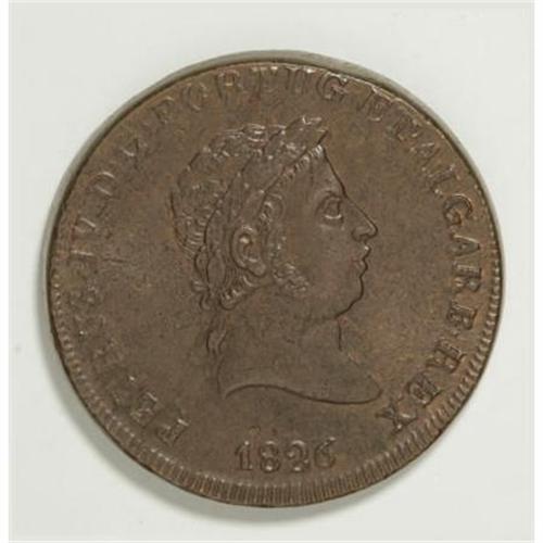 <B>Pedro IV 40 Reis 1826,</B></I> KM373, glossy brown AU-UNC with light traces of luster in the reverse legends. Very sharply struck for this thick copper series, and unusually blemish-free surfaces with just one tiny flaw above the date. Rare and desirable type in this pleasing quality.<BR><BR><b>Shipping:</b> Coins & Currency (<a target="_blank" href="http://www.heritageauctions.com/common/shipping.php">view shipping information</a>)