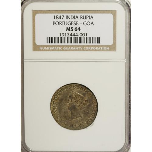 <B>Portuguese India-Goa. Maria II Rupia 1847, </B></I>KM273, MS64 NGC, an incredibly well-struck and attractive example of this usually crudely produced coinage with colorful original patina. Rarely encountered in this select quality.<BR><BR><b>Shipping:</b> Coins & Currency (<a target="_blank" href="http://www.heritageauctions.com/common/shipping.php">view shipping information</a>)