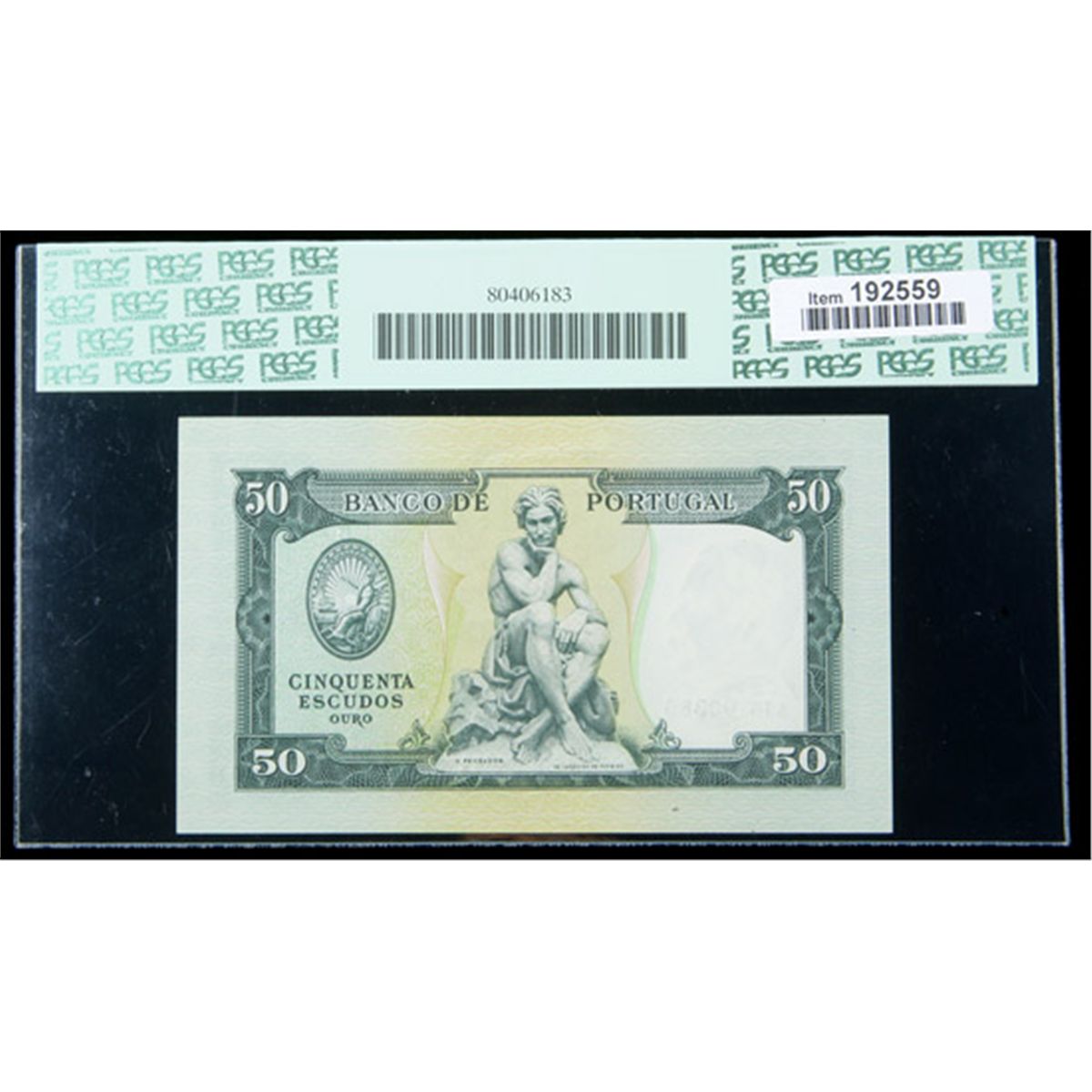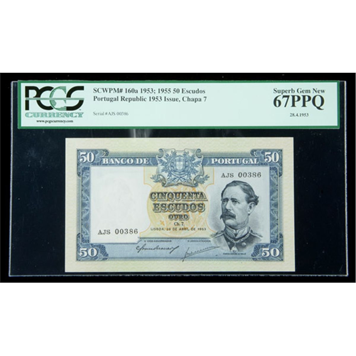 Portugal SCWPM# 160a, 28.4.1953 50 Escudos. PCGS Superb Gem New 67PPQ. . Fr-P-160a. Exceptional quality.