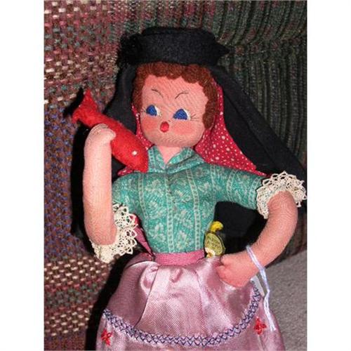 at the waist. She has embroidered features. She has yarn hair. She is holding a red felt fish in her hand. She has a Portugese regional costume.