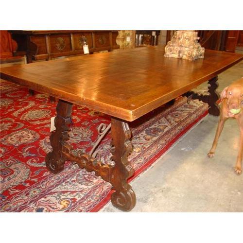 This Portugese style table from the south of France gives any room that Mediterranean flair. It has a parquet top with voluted legs and curved iron stretchers typical of the Portugese tables.
