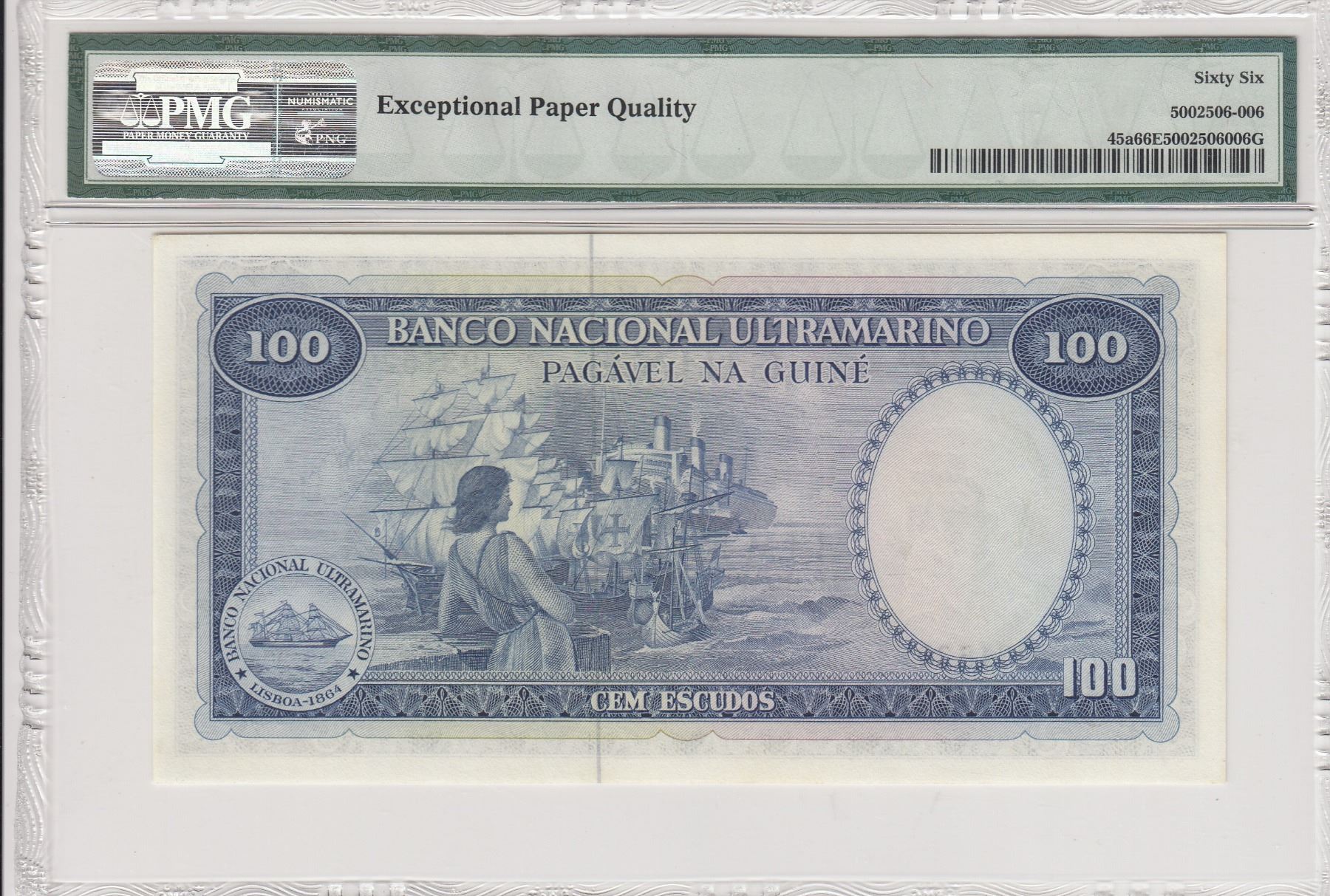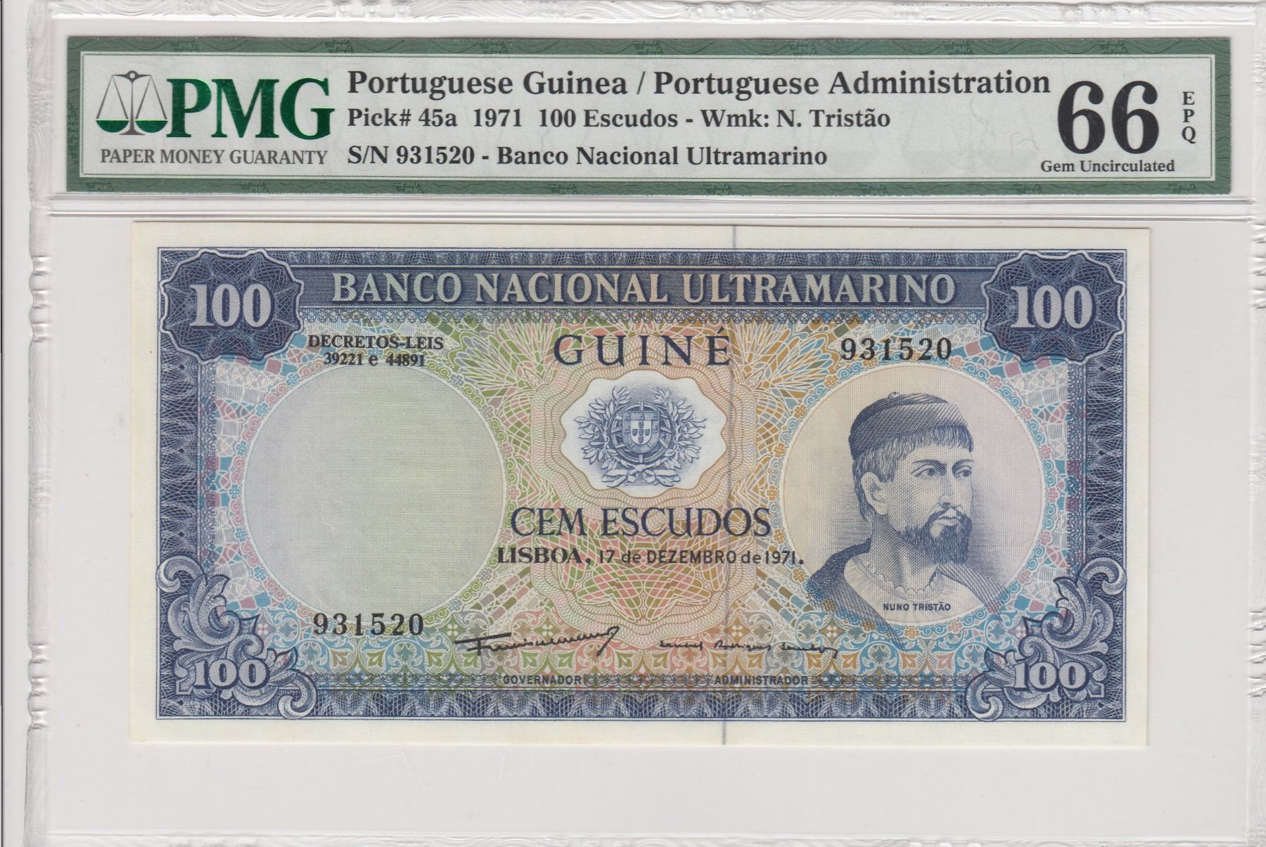 Portuguese Guinea, 100 escudes, 1971, UNC, p45abr/PMG 66 EPQ, serial number:931520