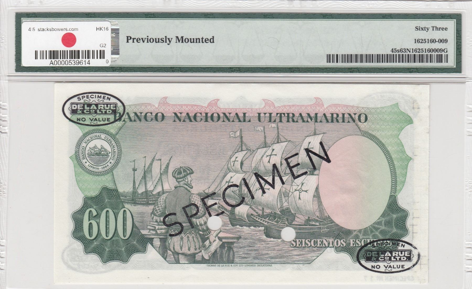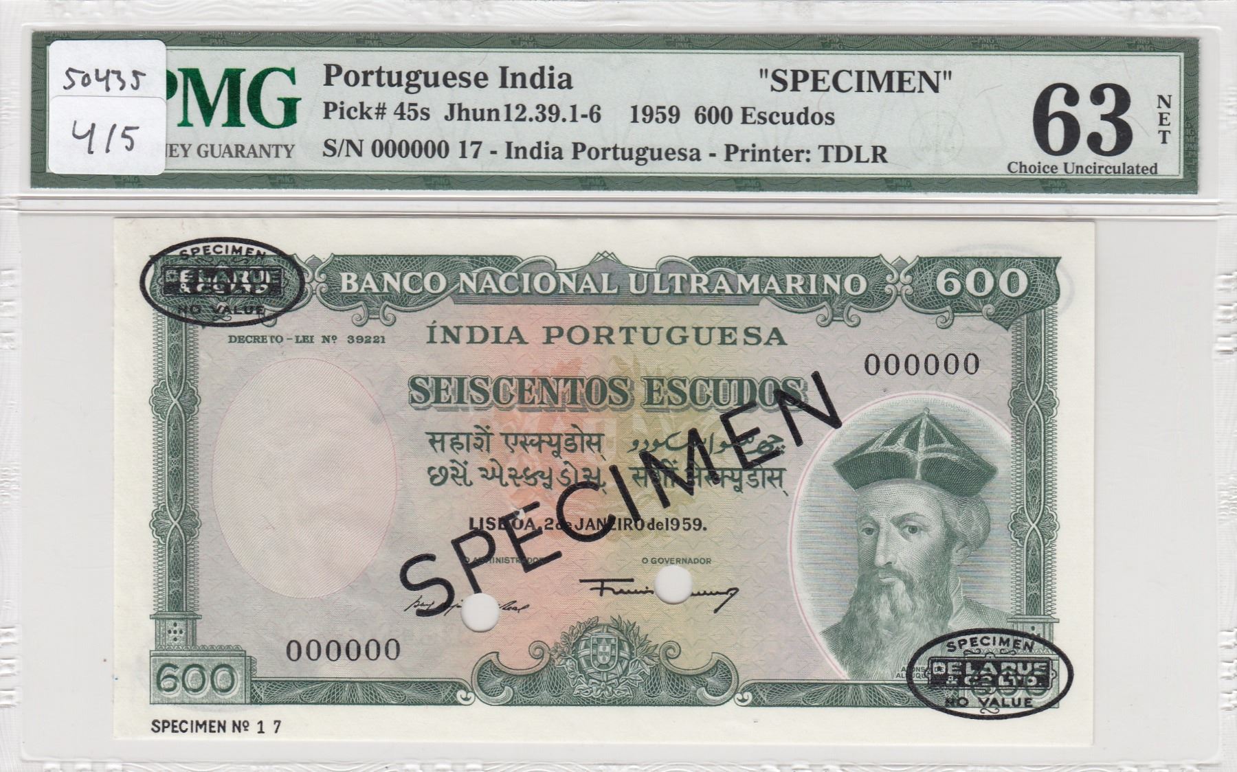 Portuguese India, 600 Escudos, 1959, UNC, p45s, SPECIMENbr/PMG 63 NET, serial number: 00000000