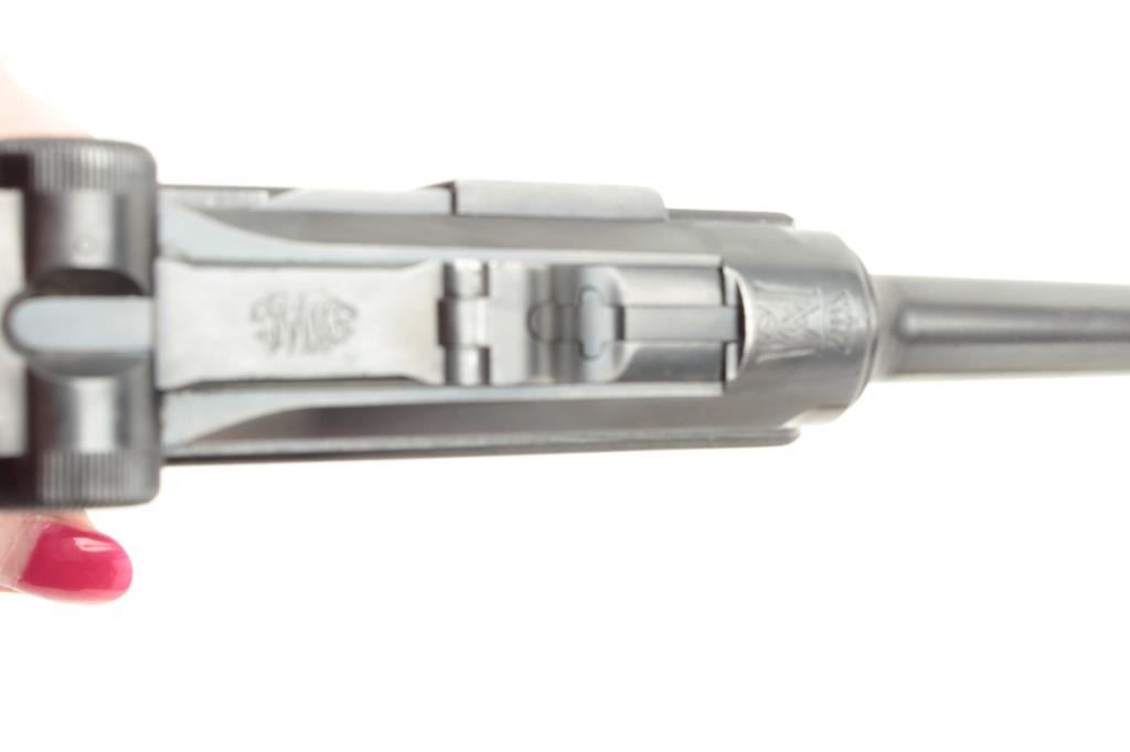 Manel 2nd on breech, S/N 1604. 75%-85% original thinning and toning blue finish showing some losses at high points, muzzle and edges. Sharp overall. Matching visible numbers and good grips with slight wear to the checkering. Correct proofs and wood bottom unmarked clip. Very bright interior with good plus bore. A collector’s Luger for the guy who likes them real rather than mint (Not real). (C&R/PPT) Est.: $1250-$2500