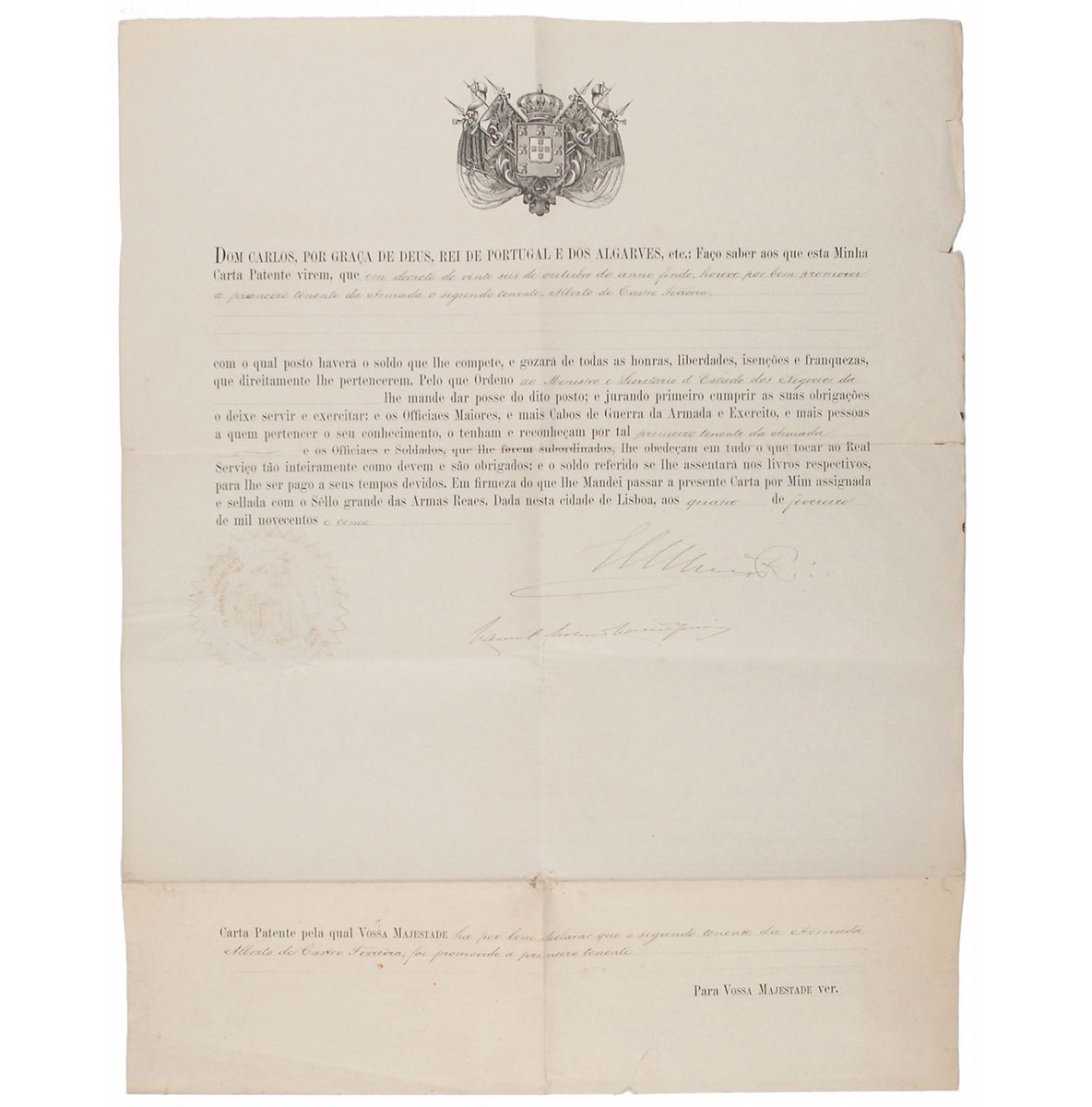 Collection of five documents, each signed by a king or queen of Portugal, including: a DS by John VI as prince regnant, “O Principe,” October 1, 1803, appointing a professor for the naval academy; a DS by Mary II as queen, “A Rainha,” August 8, 1850, appointing a customs officer; a DS by Peter V as king, “Rei,” September 14, 1858, granting a pension to the widow of a judge; a DS by Luis I, “El Rei,” October 14, 1863, appointing a customs officer; and a DS by Charles I, “El Rei,” February 4, 1905, promoting a soldier to the rank of first lieutenant. In overall very good to fine condition, with expected document wear.