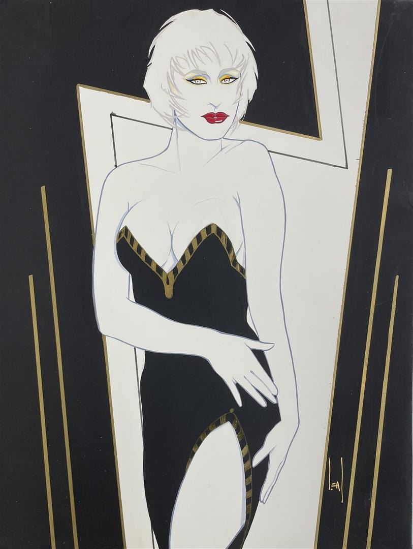 An original acrylic on board, "Pose" by Leal is a striking image of a woman 20x15" on board. Signed by the artist, it has one dog-earned corner.