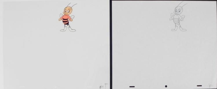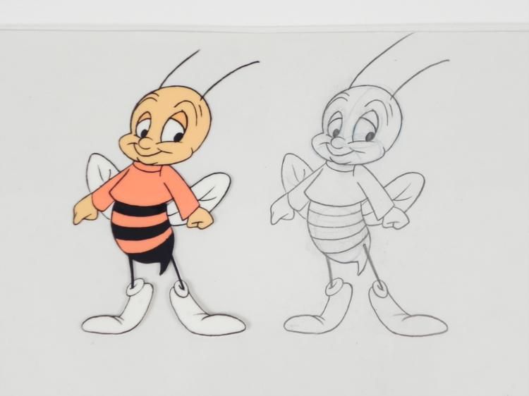 Buzz appears to be posing for the camera. This original animation cel & drawing are from the production of the Cheerios cereal commercial. * Original Animation Cel & DrawingMedium: Hand painted acetate celDetails: Animation notations and peg holes * Original "rough" animation drawing, in non-photo blue and black pencil * Size of cel: 10 1/2 x 12 1/2 inchesSize of drawing: 10 1/2 x 12 1/2 inches * Condition: Very goodThis is an original hand-painted cel set-up used in the production of the "Cheerios commercial." Each one-of-a-kind set-up represents a slight change in position of the characters. When individually photographed and projected in rapid succession, the images appear to move. To created production cels, the original animator's drawing is transferred onto an acetate cel (by hand-inking and/or photo copying). The cel is then hand-painted on the reverse side. * * Traditional animation is a multi-step process which includes various types of art techniques. Drawings are a key part of the process, in which the animator creates the design and movement of the characters. Drawings are then transferred onto acetate cels.