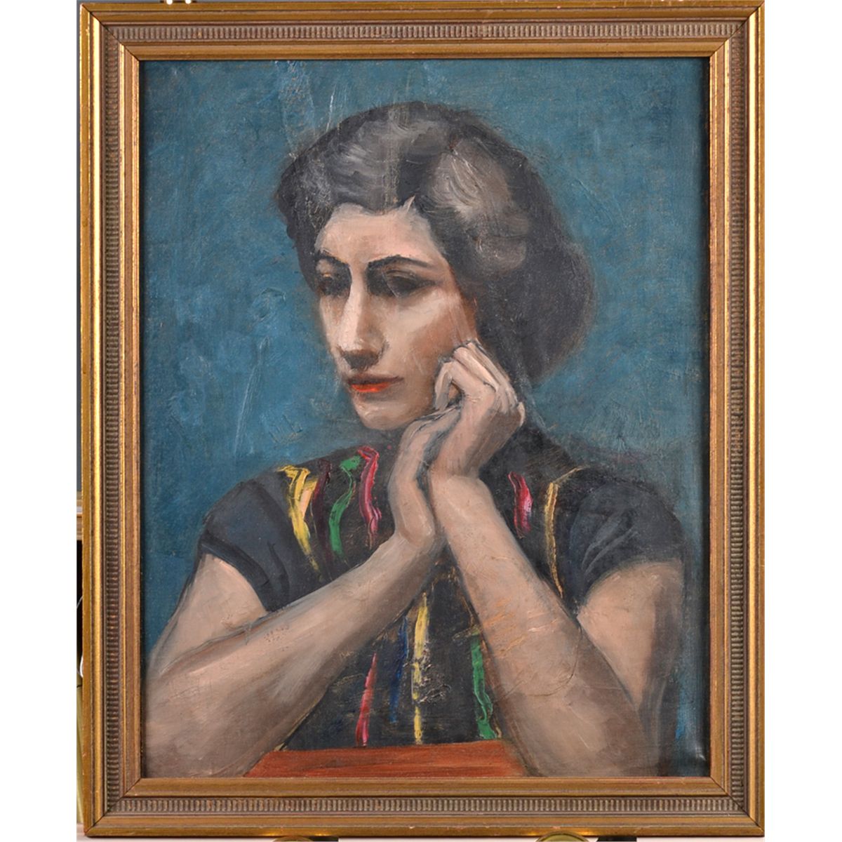 Depicting a woman in a pensive pose, wearing a colorful blouse, striped on a dark background. This portrait is very reminiscent of the work done by Henri Bellows and Soyer. Unsigned, in a gold tone and wood frame. 22" H x 18.25" W, including the frame. Circa 1940's/1950's. Private collection Troy, MI.