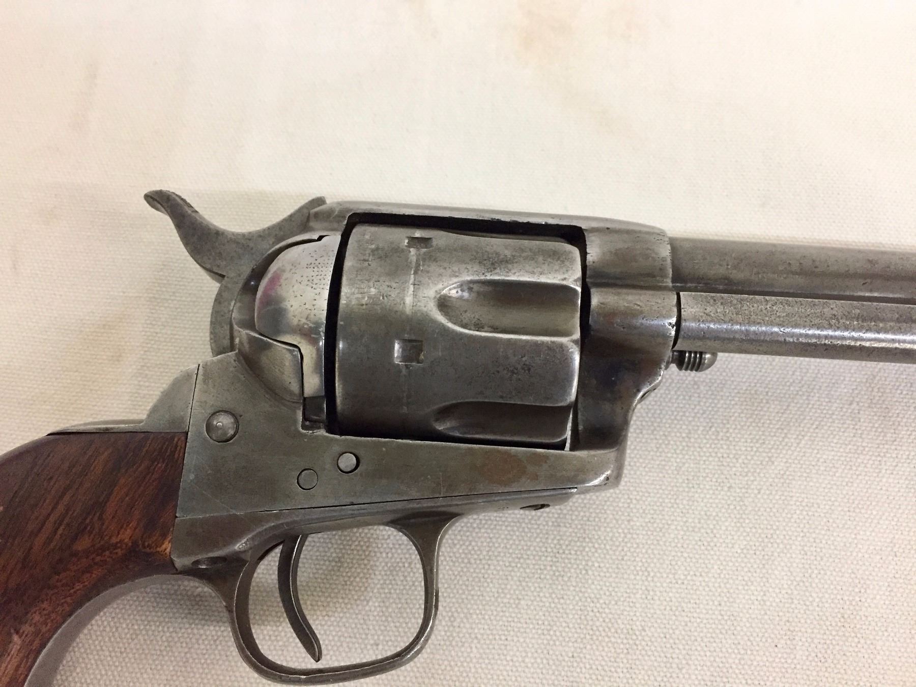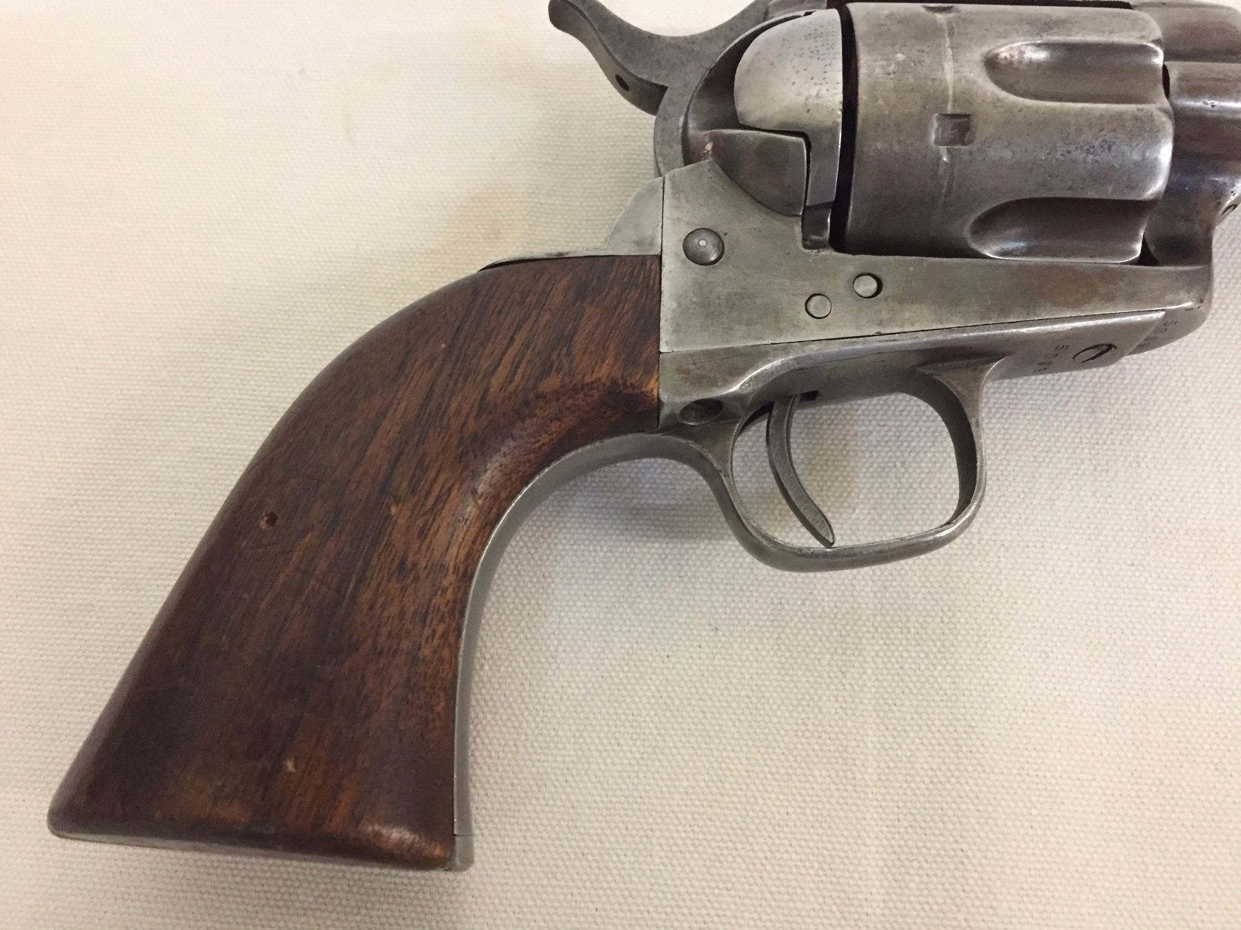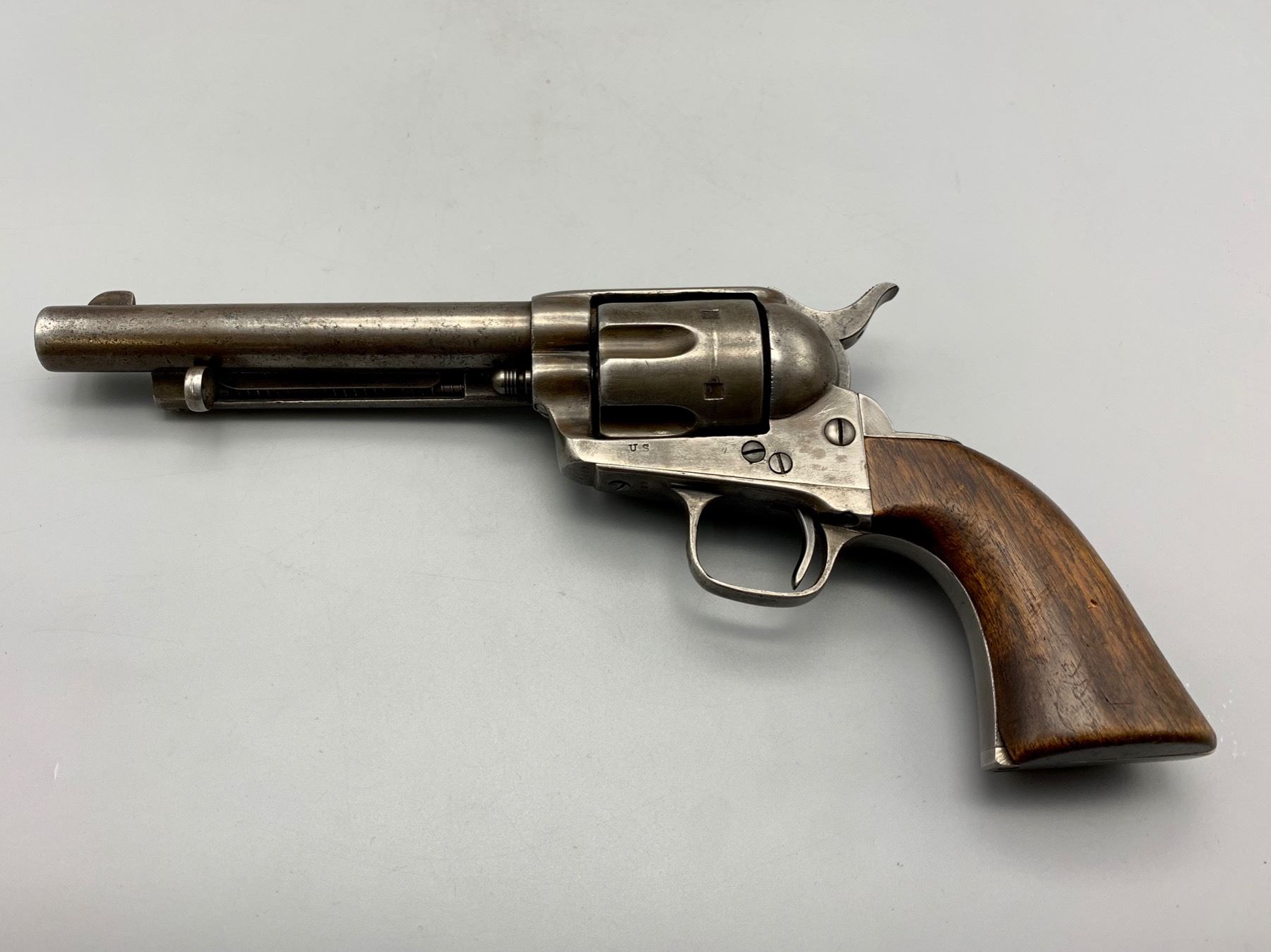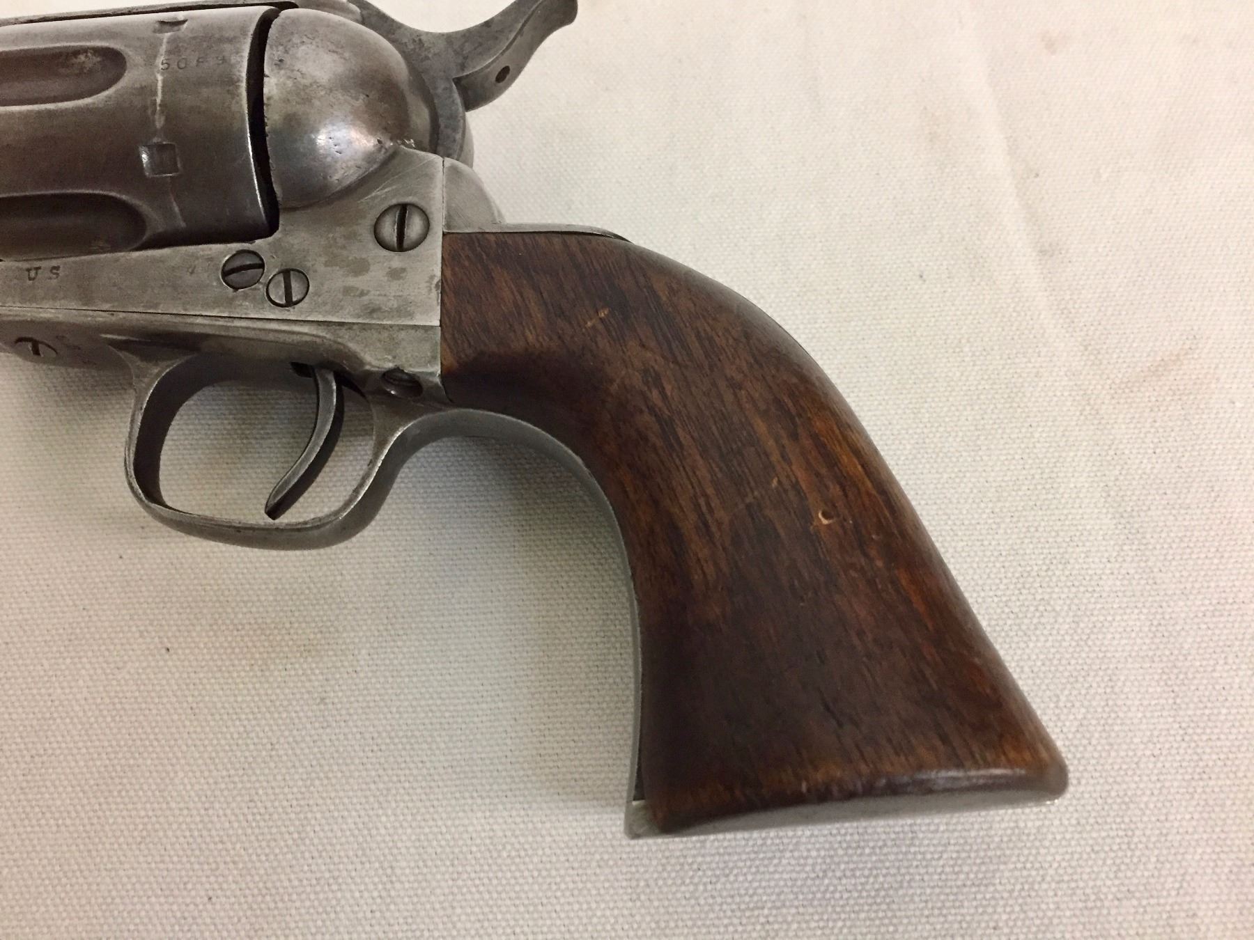 Description: 45. cal Single Action Colt Army. Possibly a 7th Cavalry revolver as the Serial No. is 5089. We have a whole article of research that was done (and published) on this revolver. We would be happy to email a link to the article on request or you can go to: https://www.westerntradingpost.com/blog/2018/12/23/early-saa-colt. We are selling this as an antique / curio item and not warranted safe to shoot. No FFL paperwork required on this antique pistol which was made pre-1898. We will only ship this item to the United States and only where it is legal to do so. Please know your local/state laws before buying. Maker: Colt. Approx. Age: Circa 1874. Size: Pistol has a 5” barrel and measures approx. 11.5” long overall. Comes with the carrying case which measures 13” w x 8” long. Condition: Fair. Seems to function and cycle properly, but we have not tested it in any way. Please read the article mentioned above for a fully detailed report. Copy and paste this link for the article: https://www.westerntradingpost.com/blog/2018/12/23/early-saa-colt Please look closely at the pictures - they are an important part of our description. Shipping: There will be a $10 handling / packaging fee for shipping this lot. The actual cost of postage will be added on top of that.