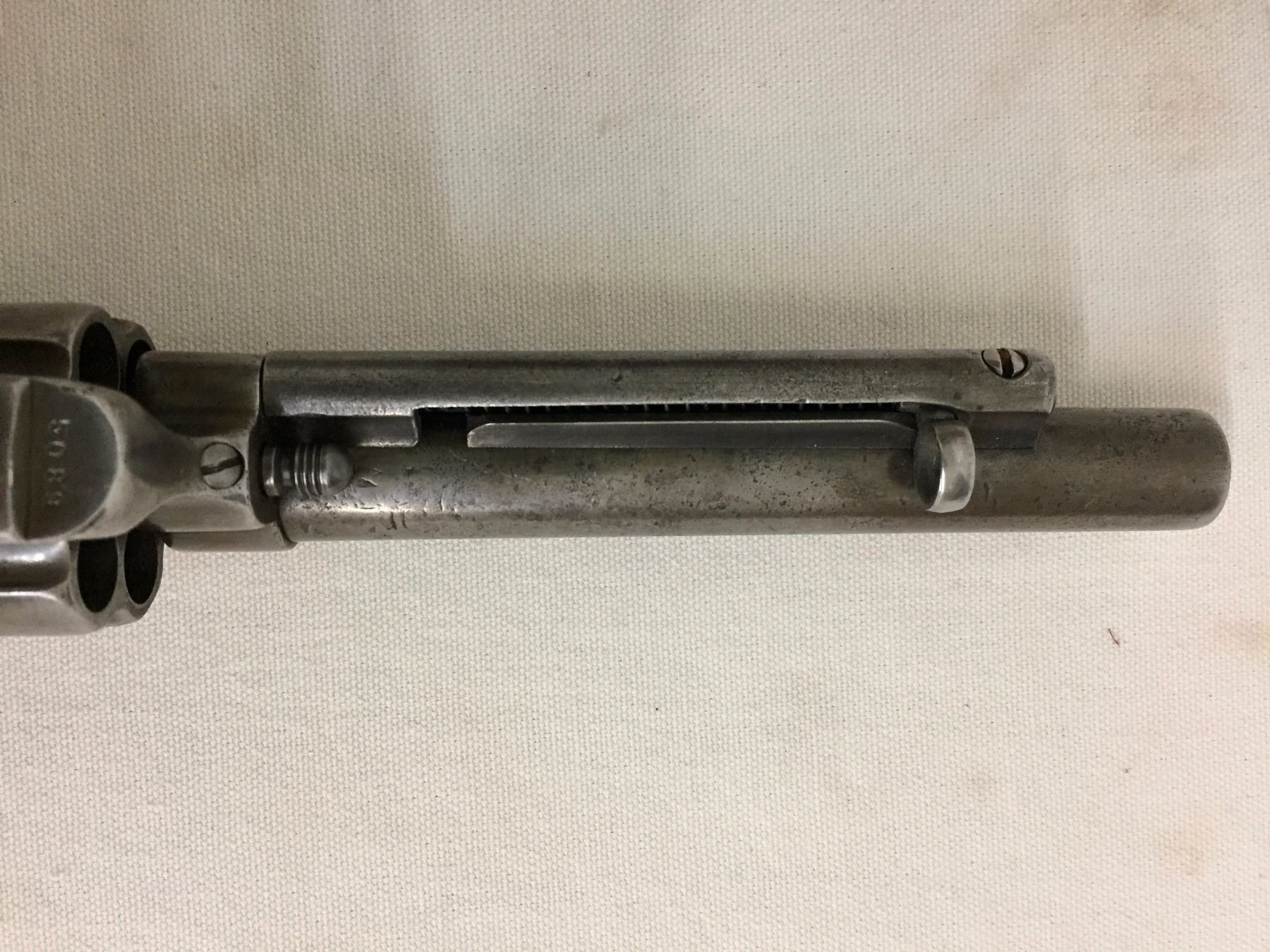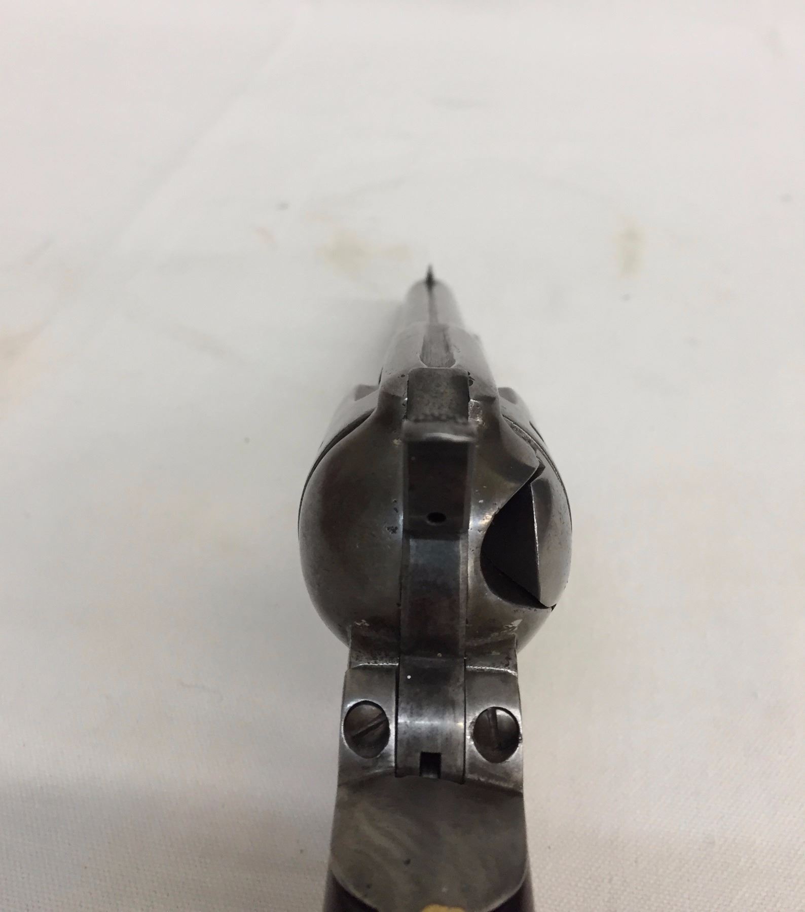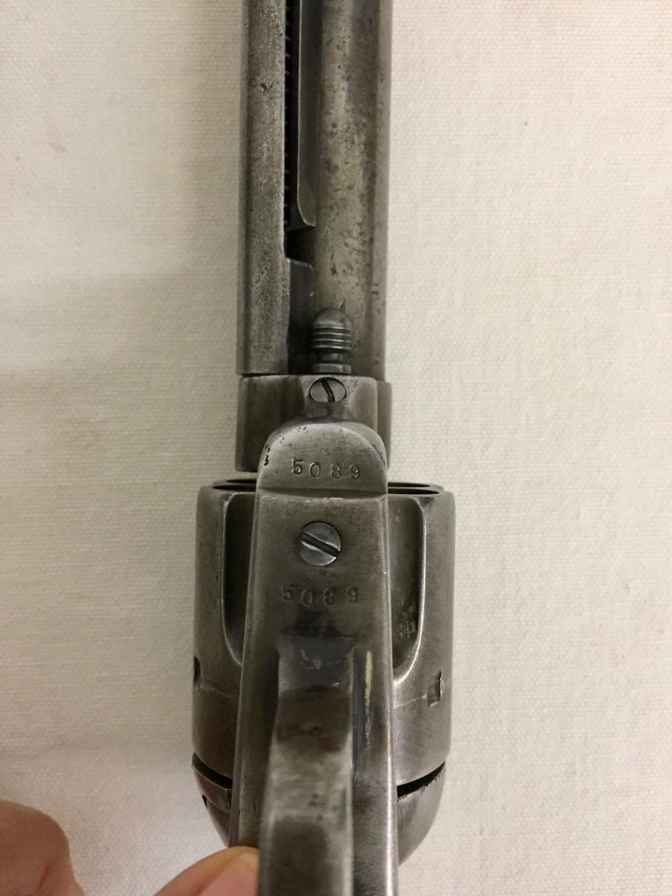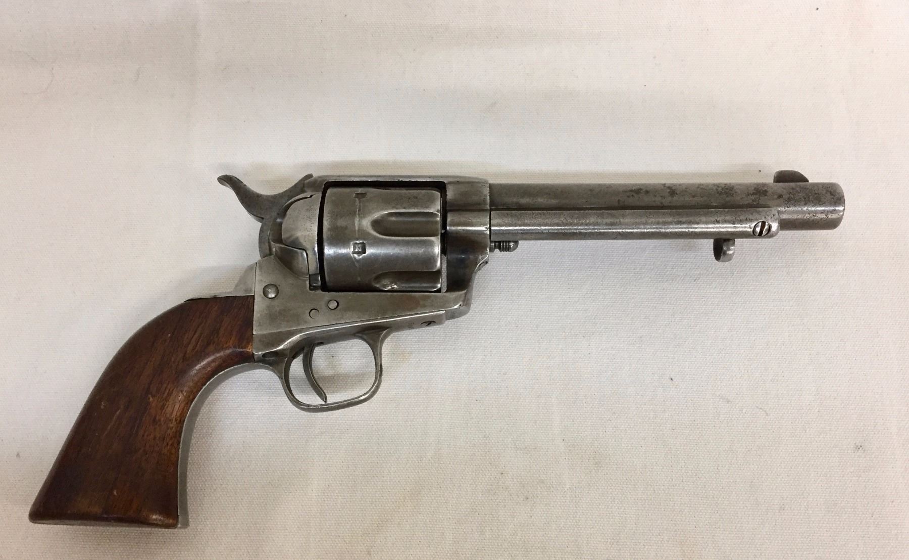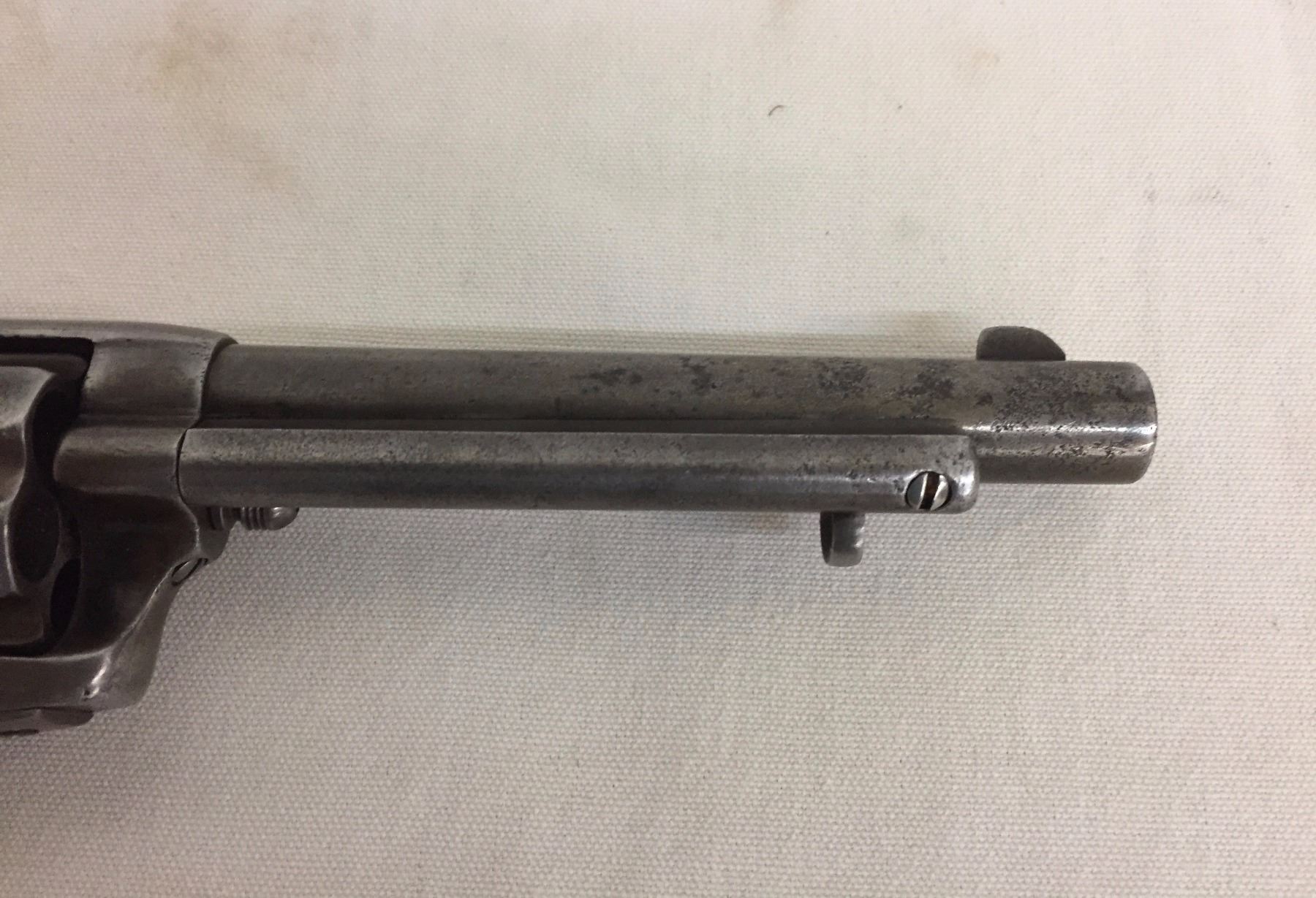 Description: 45. cal Single Action Colt Army. Possibly a 7th Cavalry revolver as the Serial No. is 5089. We have a whole article of research that was done (and published) on this revolver. We would be happy to email a link to the article on request or you can go to: https://www.westerntradingpost.com/blog/2018/12/23/early-saa-colt. We are selling this as an antique / curio item and not warranted safe to shoot. No FFL paperwork required on this antique pistol which was made pre-1898. We will only ship this item to the United States and only where it is legal to do so. Please know your local/state laws before buying. Maker: Colt. Approx. Age: Circa 1874. Size: Pistol has a 5” barrel and measures approx. 11.5” long overall. Comes with the carrying case which measures 13” w x 8” long. Condition: Fair. Seems to function and cycle properly, but we have not tested it in any way. Please read the article mentioned above for a fully detailed report. Copy and paste this link for the article: https://www.westerntradingpost.com/blog/2018/12/23/early-saa-colt Please look closely at the pictures - they are an important part of our description. Shipping: There will be a $10 handling / packaging fee for shipping this lot. The actual cost of postage will be added on top of that.