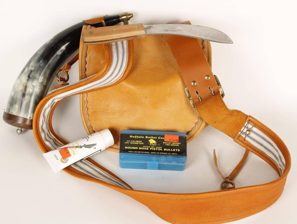 Leather bag with powder horn and Green River Works skinning knife. Interior is lined with mattress ticking material and has an interior divider. Includes bullets, wads, powder measures, Nipple grease and tools.