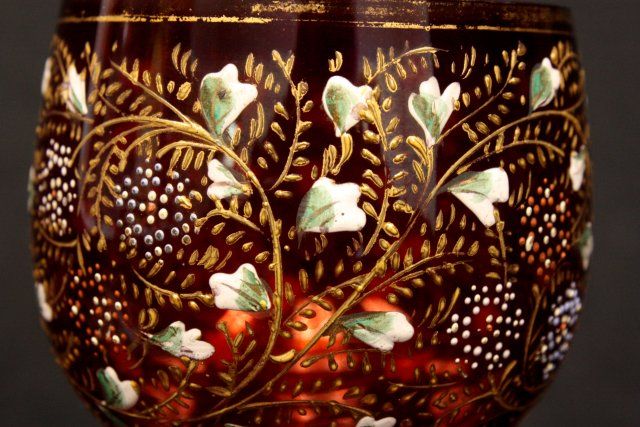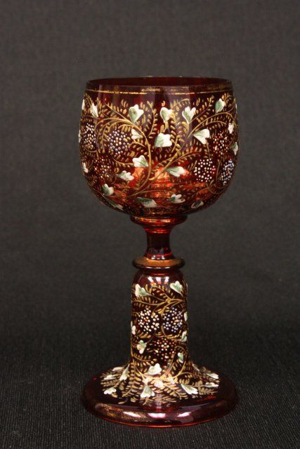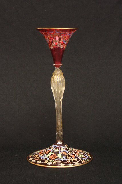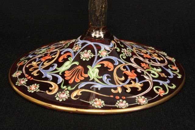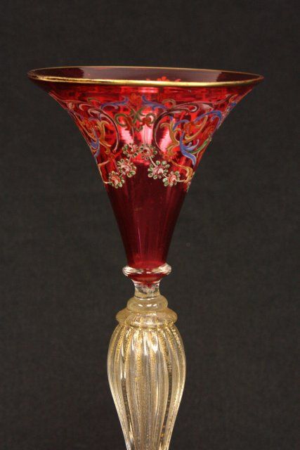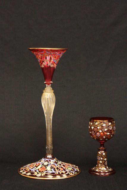 1- Possibly Moser glass goblet, approx. 5.5" H. 1- Enamel & glass Murano vase, cranberry colored glass, approx. 12.5" H. Please read our terms of sale.