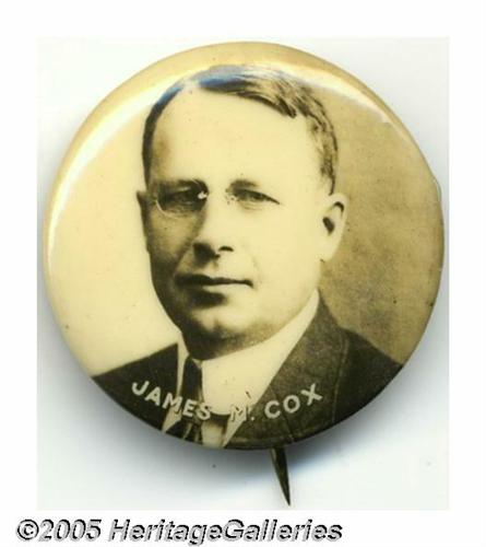 <B>Possibly Unique 1 1/4" 1920 James M. Cox Button</B></I> While rare in itself, we have seen this St. Louis Button design various times in 7/8" size. But we did not know it came in this much more imposing 1 1/4" version. Cox buttons, along with those of John W. Davis, are by far the toughest of any 20th century Presidential candidate. The appearance of a never-before-seen 1 1/4" variety is a significant opportunity for serious celluloid collectors. Condition is very choice and "minty." For strictest accuracy we note a <I>tiny</B></I> and utterly inconsequential rim bump at 3:00, a result of the crimping of the celluloid in manufacture. Lot:262