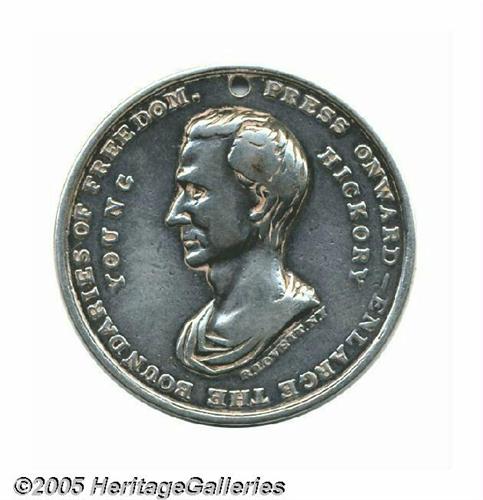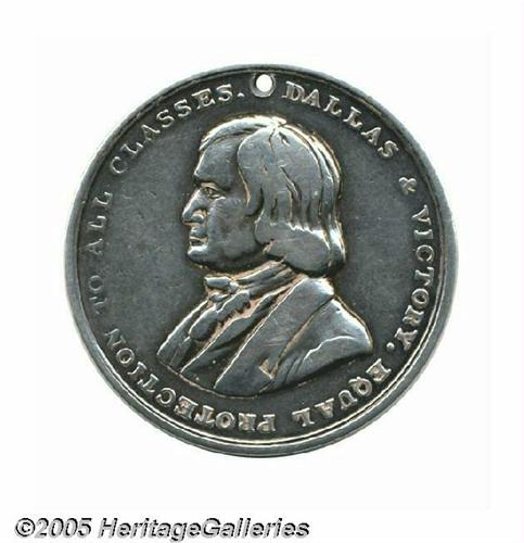 <B>Possibly Unique 1844 James K. Polk - George M. Dallas Medal in Silver</B></I> Listed by Sullivan only in white metal as JP 1844-3. All Polk items are rare, and this medal would command a price in the $1,500-2,000 range in the standard white metal. This is the only silver example we have ever seen and as a genre campaign medals struck in silver have been highly coveted since the days of the 19th century collectors. Formerly in the legendary U. I. "Chick" Harris collection, and one of the few items from that legendary collection which Joe Brown felt compelled to acquire for his own collection when it came to auction. It sold for just under $2,800 in the 2000 Harris Auction, and seemed quite a good value at that time. Attractive very fine condition. 39 mm. Lot:256