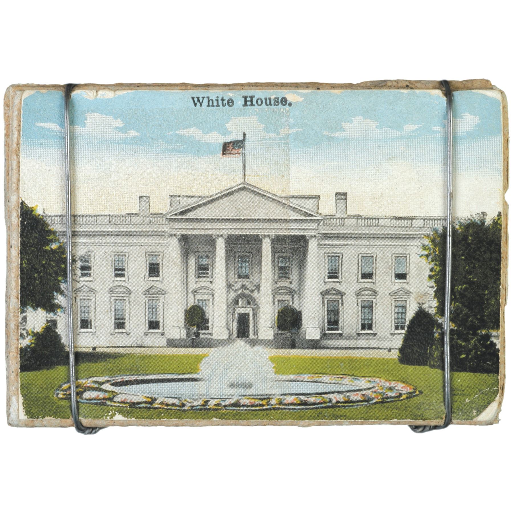 This extremely rare and unusual form of Macerated Currency, its design made to resemble a Bale of Macerated Paper, but looks more like folded wads of money. This bundle, measuring 2.25” tall x 3.25” wide x .75” thick, has a Postcard image of the White House on its top and an official original BEP printed label on its bottom, all of which is held together by two steel wires. The Bureau of Engraving and Printing label reads: “More than 100 Bales of this U. S. Macerated Money, each weighing 250 pounds, are turned out Daily by the Bureau of Engraving and Printing. Estimated value $1,000.” There are some trivial scuffs or bumping to the corners, otherwise this bundle or “Bale” is pretty much as made. Exceedingly Rare and desirable. An item for the most sophisticated of Macerated United States Currency Bank Note collectors.